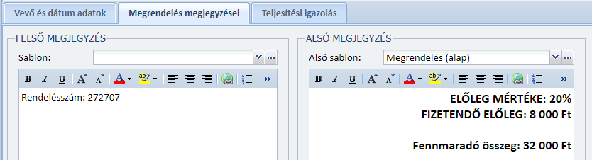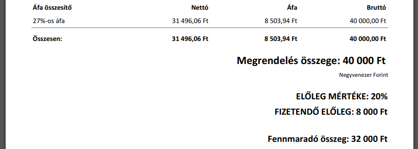 - Előleg bekérő kiállítása: hozzunk létre az Értékesítés / Megrendelések alatt egy megrendelést (a fejléc szövege átnevezhető a Bizonylat tömbök menüpont alatt tetszőlegesen “Díjbekérőre”, vagy “Proforma számlára”, vagy kinek mi tetszik lényegében). A megrendelésen alsó megjegyzésként fel lehet tüntetni kézzel a fizetendő előleg értékét, ha előleg bekérőnek csak részösszeget szeretnénk megadni!