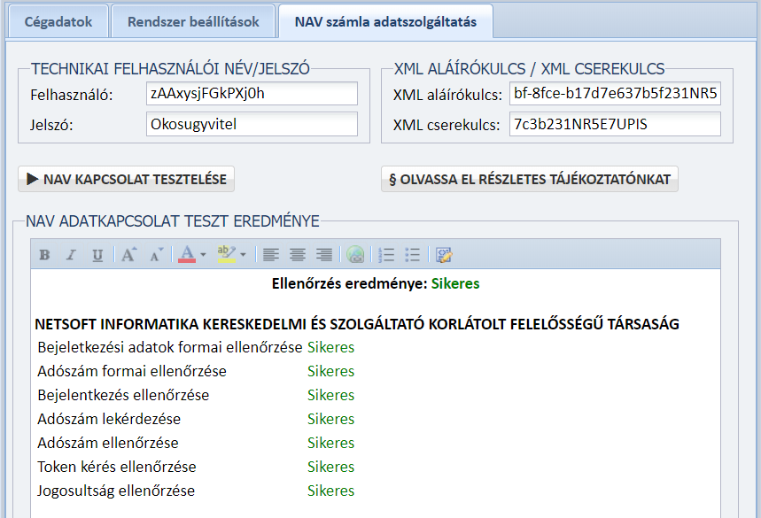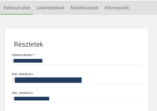 Emlékeztetőül a Technikai felhasználó részletei alatt található a Technikai felhasználó felhasználói neve, XML aláírókulcs és XML cserekulcs (a Technikai felhasználó jelszavát a Technikai felhasználó létrehozásakor adtuk meg!):