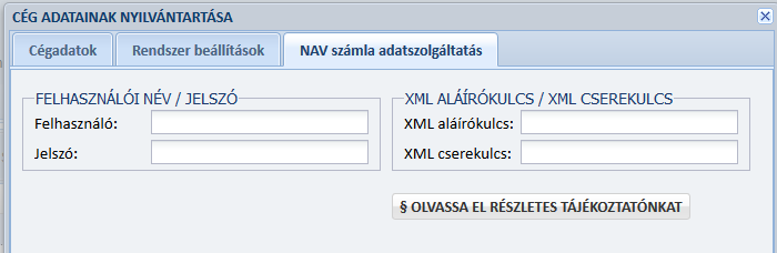 Törzsadatok / Cégadatok ablakot nyissuk meg és ott válasszuk ki felül a “NAV számla adatszolgáltatás” menüpontot: